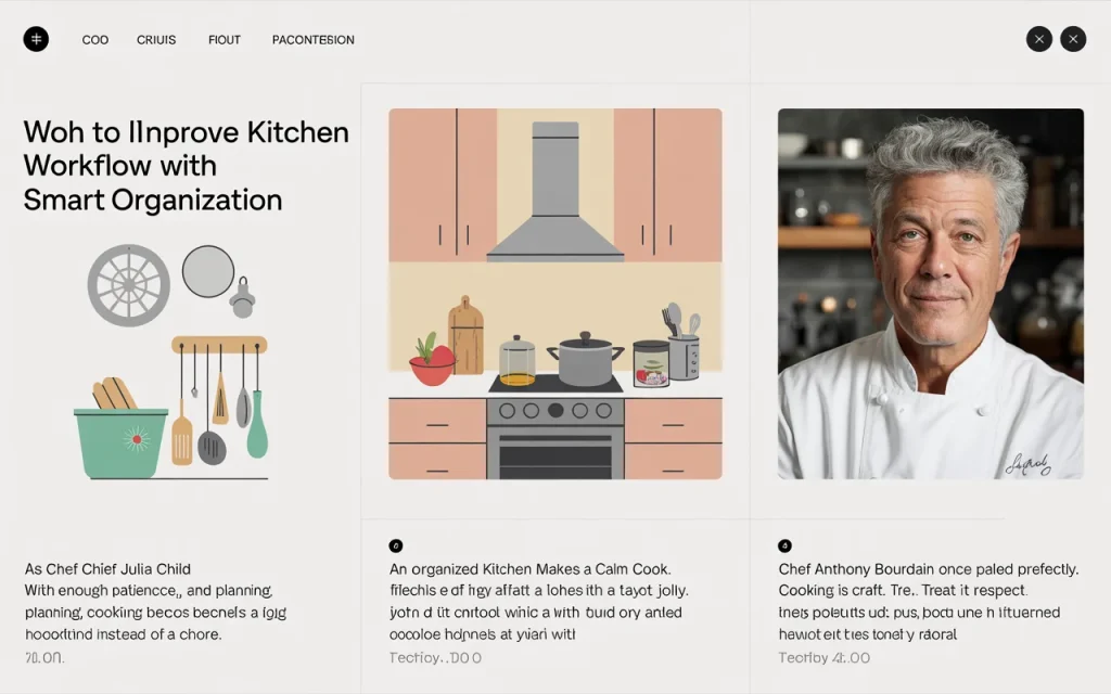 Professional chefs rely heavily on efficient workflow. In restaurant kitchens, every movement is planned. While a home kitchen does not need to be that strict, the same ideas still work extremely well. Small improvements such as organizing prep zones, keeping tools within reach, and managing counter space can transform how a kitchen functions.