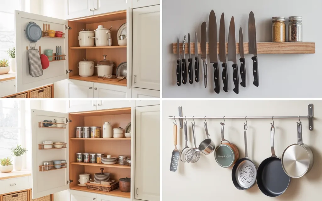Use the inside of cabinet doors. Add small racks or hooks. This is a good spot for pot lids, measuring cups, or oven mitts. It uses space that often goes to waste.