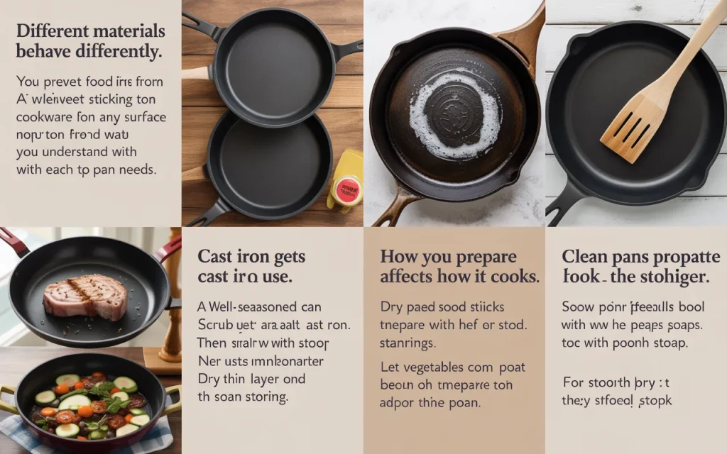 Different materials behave differently. You can prevent food from sticking to cookware on any surface if you understand what each pan needs.