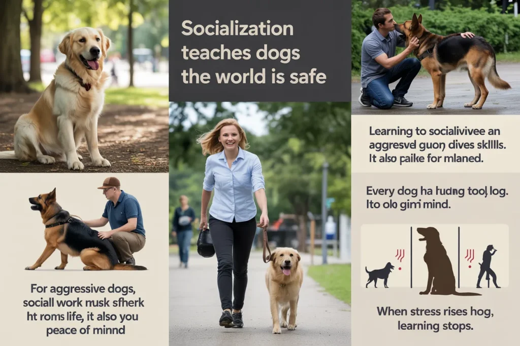 Socialization teaches dogs that the world is safe. It replaces fear with calm. For aggressive dogs, social work must be slow and planned.