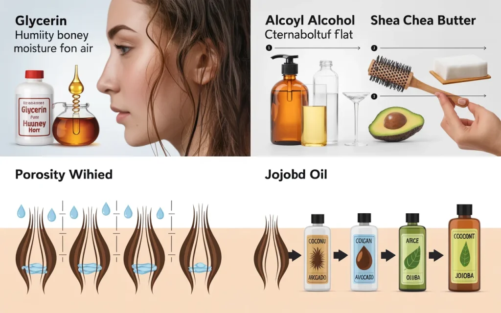 Humectants. Glycerin and honey pull moisture from the air into your hair. These are excellent if you live in a humid climate. In dry climates, they can actually pull water out of your hair. Adjust based on your weather.